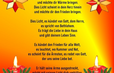 Ein bisschen mehr Friede und weniger Streit, ein bisschen mehr Güte und weniger Neid. Ein bisschen mehr Wahrheit immer da und viel Hilfe bei jeder Gefahr. Ein bisschen mehr wir und weniger ich,...