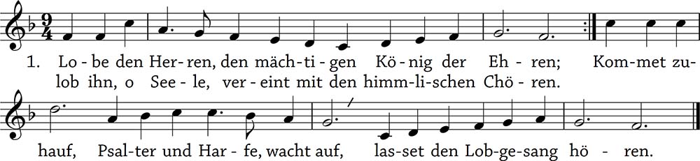Lobe den Herren, den mächtigen König der Ehren; / lob ihn, o Seele, vereint mit den himmlischen Chören. / Kommet zuhauf, / Psalter und Harfe, wacht auf, / lasset den Lobgesang hören.